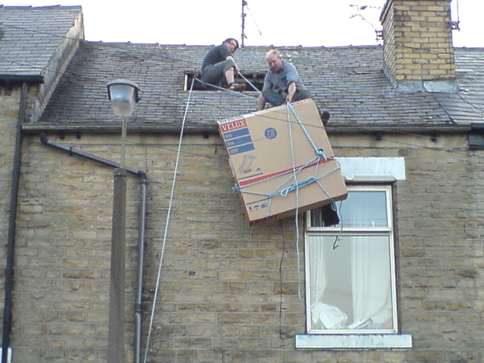 us manoeuvred the package through the skylight opening, keeping it secure on the rope the whole